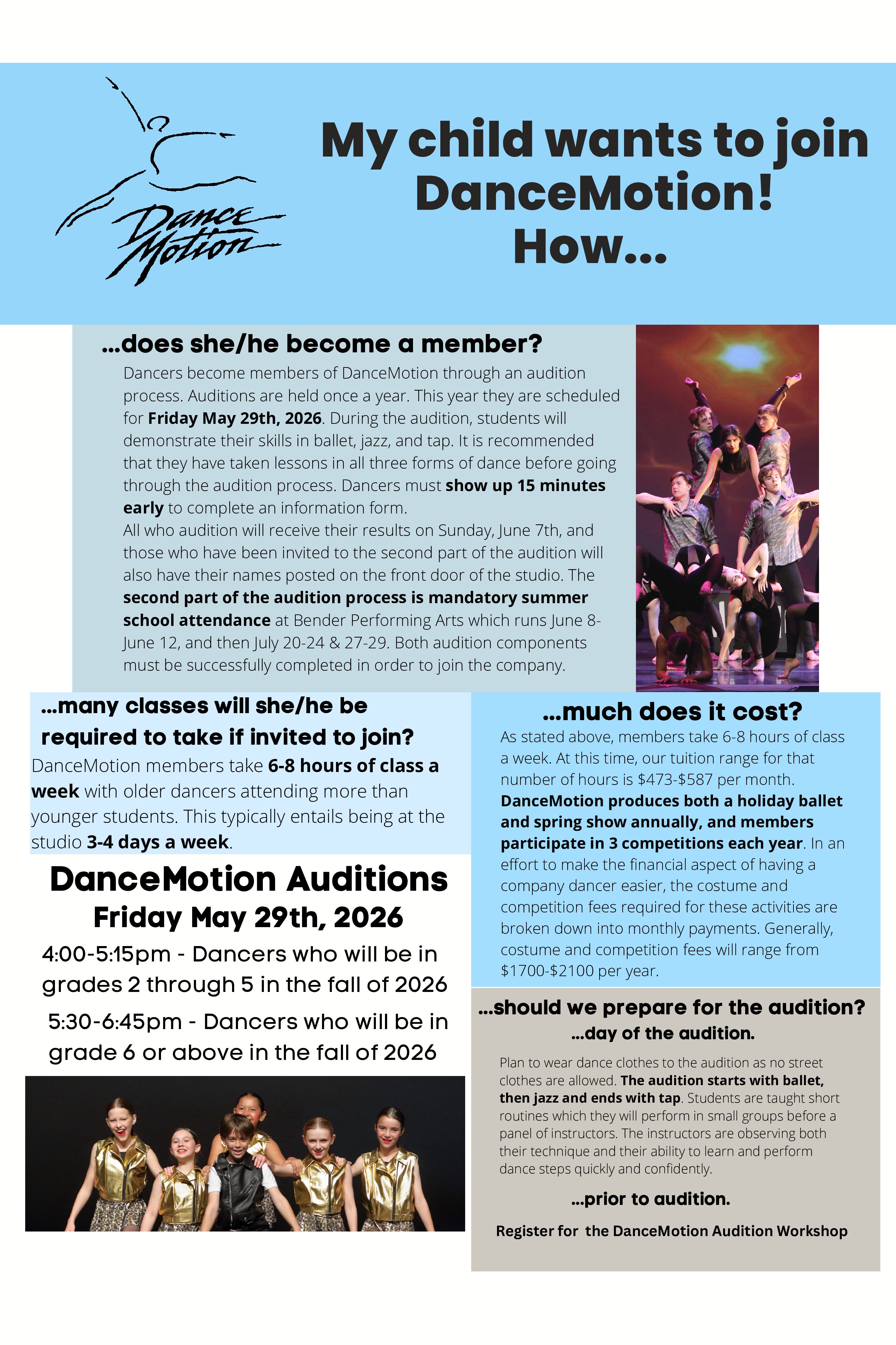 Calling all dancers! Are you ready to take your dance journey to new heights? We are thrilled to announce auditions for the DanceMotion Performing Company on May 29th, 2026!